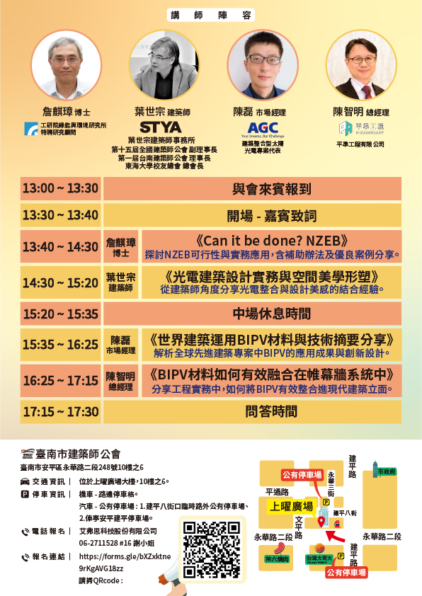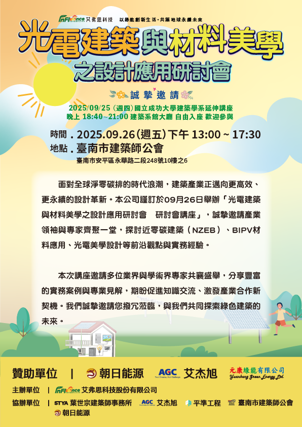 本次研討會以「推廣光電建築與材料美學」為核心,艾弗思科技特邀產業與學術專家進行經驗分享與技術交流。講者陣容包括:工研院綠能與環境研究所特聘顧問詹麒璋博士、葉世宗建築事務所主持建築師葉世宗、日商艾杰旭(AGC)亞太分公司經理陳磊,以及平準工程總經理陳智明。與會者將探討近零碳建築的可行性,解析如何將光電設計與建築美感融合,並分享國際成果與創新案例,期望激發跨領域合作與新思維,進一步提升台灣在建築與光電整合技術上的能量。